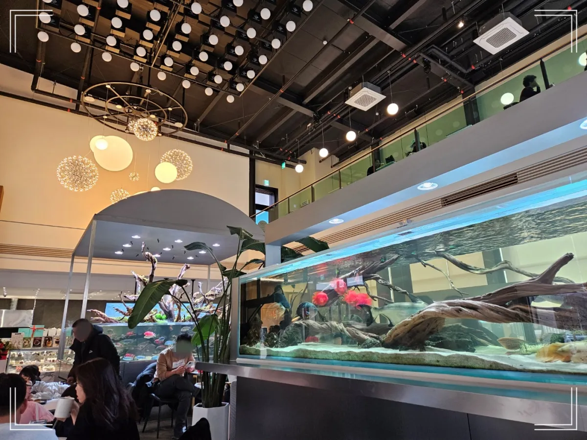 전체적으로 수족관의 물을 보며 물멍을 할 수 있고 통창으로 바깥풍경을 즐길 수 있어요. 하지만 인기있는 카페인 탓에 주말에는 사람이 북적북적해요. 하지만 이용을 못할 정도로 불편한 건 아니니 걱정 마시고 한 번 방문해 보세요.