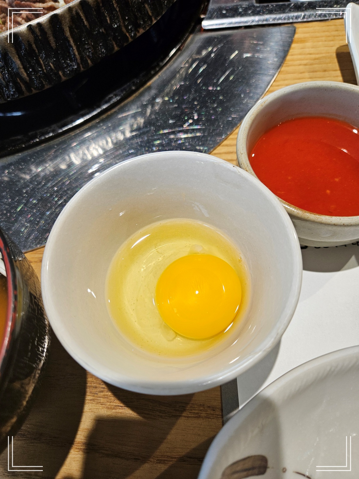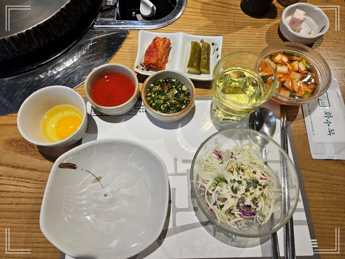 다양한 채소와 고기를 맛있게 즐기시기 좋고 밥과 된장국도 따로 주시니 한 끼 식사로 딱 좋은 구성이에요. 한식과 일식의 중간쯤의 가정식 상차림을 같이 주시는데 스끼야끼와 잘 어울리는 구성으로 챙겨주셔서 좋더라고요. 폰즈베이스인듯한 츠케소스와 매콤한 칠리소스 그리고 신선한 계란을 같이 주셔서 취향에 따라 소스를 찍어먹을 수 있는 점도 좋았어요. 그리고 놀랐던 부분 중 하나가 반찬으로 나온 김치를 담은 모습이었어요. 아주 정갈하게 딱 말아져서 담겨있었는데 한눈에 보기에도 손이 많이 간 것처럼 정성스럽게 담겨있었어요. 저도 현업에 있을 때 이렇게 김치를 썰곤 했는데 옛 생각이 문득 났답니다 ㅎㅎ(보통 손이 많이 가는 작업이 아니거든요.) 이런 상차림 하나하나에 정성이 들어가 있는 걸 보니 오랜 기간 동안 사랑받는 식당에는 분명 이유가 있고 비결이 있다는 생각이 많이 들었어요.