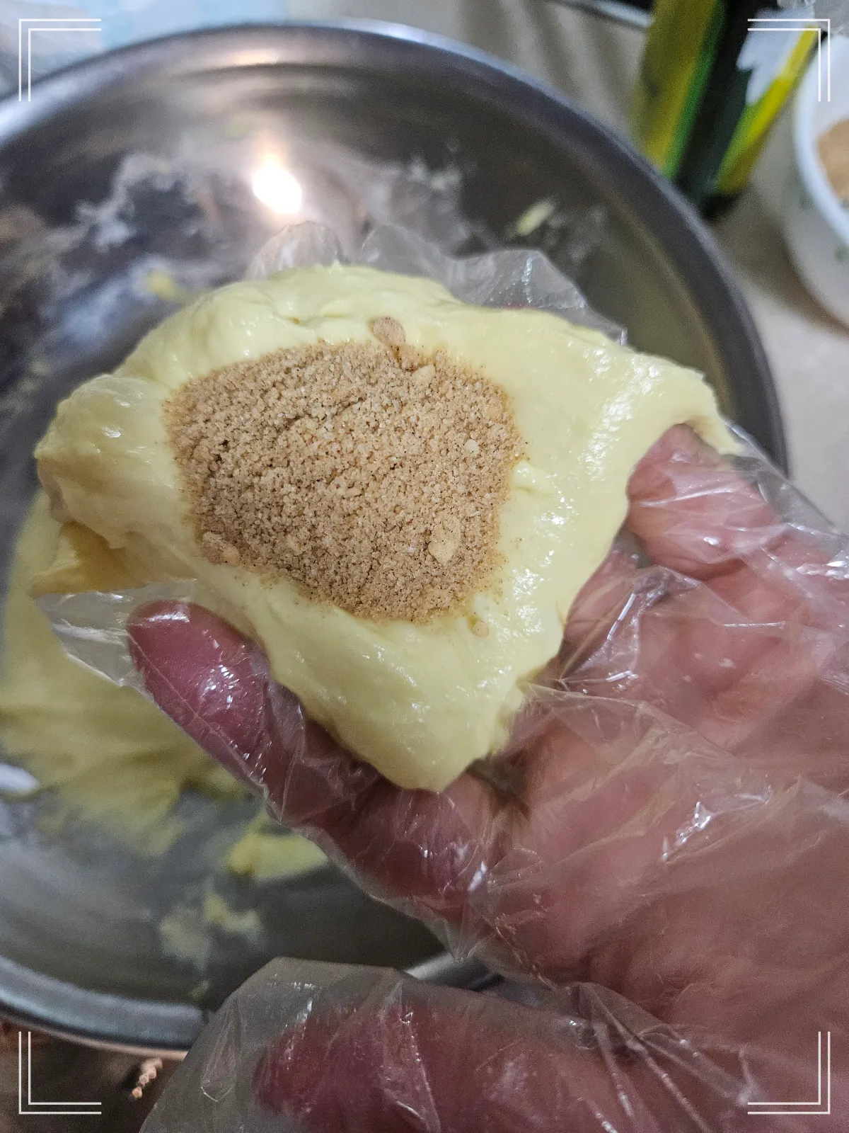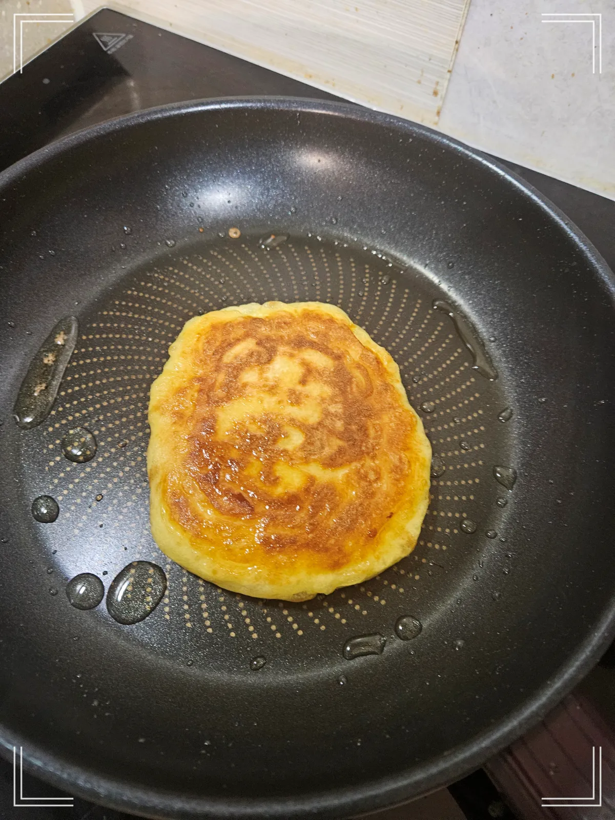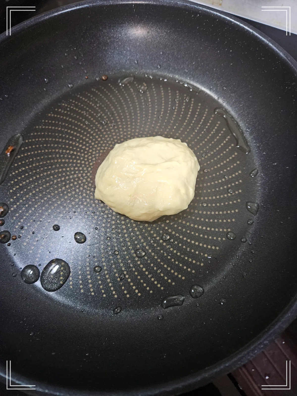 설명을 읽어보니 동봉된 가루에 물을 붓고 가루 이스트를 넣어 반죽이 부풀기를 기다렸다가 속을 채워서 직접 구워주면 되는 방식이었어요. 과정은 생각보다 쉬웠고 직접만든다니 아이들도 좋아했어요. 하지만 찹쌀반죽이다보니 장갑을 낀 손에 식용유를 발라가며 해주어야 했고 아이들은 거의 반죽장난 수준이었지만 즐거워했어요. 결과물보다는 과정이 즐거우면 된 거 아니겠어요?ㅎㅎ 그렇게 찹쌀반죽을 성형해 주고 안에 호떡용 잼믹스를 넣어주는데요. 이 과정이 생각보다 어렵더라고요. 반죽이 터지지 않도록 하기 위해 적당량을 넣으면 나중에 구웠을 때 호떡의 핵심인 시럽이 생각보다 적게 들어가게 되더라고요. 그래서 조금 터지더라도 넉넉히 넣어줍니다. 그리고는 최대한 반죽을 끌어모아 터지지 않게 잘 성형해주어요. 그다음 넉넉하게 식용유를 두른 펜에 구워줘요. 호떡집 트레이드 마크인 누름기가 있으면 이쁘게 모양을 잡아 눌러가며 구울 수 있겠지만 저는 없는 관계로 뒤집개로 최대한 눌러줘요.