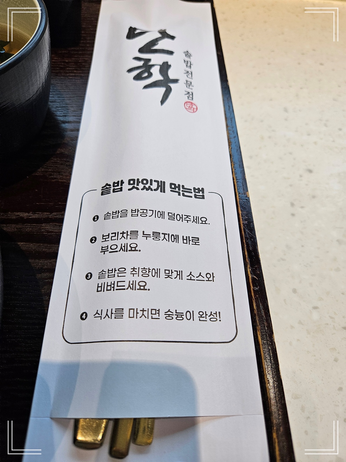푸드코트 식당처럼 주문을 하면 진동벨을 주시고 음식이 나오면 진동벨이 울리는 식인데요. 한 상차림으로 나오는데 보온 컵(?)에 보리차가 나오는데요. 솥에서 밥을 덜어내고 남은 누룽지를 불려서 숭늉으로 만들어 먹는 용도더라고요. 그래서 밥을 따로 준 그릇에 덜어내고 솥에 보리차를 부어줘요. 그럼 솥밥을 맛있게 먹고 난 후에 솥에는 누룽지 숭늉이 되어있어서 개운하게 드실 수 있어요. 그런데 제가 갔을 때는 바쁜 시간대라 그런지 보리차가 덜 뜨거워서 미지근했어요. 뜨거운 숭늉을 좋아하시는 분들은 보리차를 뜨겁게 데워달라고 하시면 더 좋을 것 같아요. 바쁜 점심시간대에 든든하게 속도 채우고 영양까지 채울 수 있는 메뉴를 찾으신다면 방문해서 드셔보세요. 추운 겨울을 든든하게 날 수 있을 거예요.