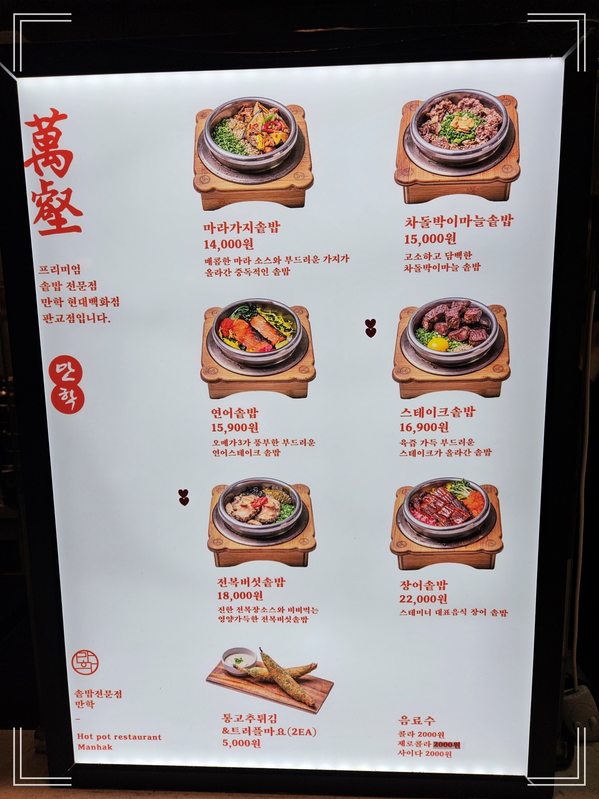 설 연휴가 끝나고 모처럼 아내와 둘만의 휴일이 딱 하루 있었어요. 아이들도 다 유치원, 어린이집으로 등원하고 저희 둘만 있을 수 있는 반나절의 휴가였죠. 무얼 할까 고민하다가 아침시간에는 각자 개인적인 일을 보고 점심때 만났어요. 제가 한창 갤럭시 S25시리즈에 관심이 있었던 터라 실물을 보기 위해서 집에서 가까운 매장을 찾아보다가 현대백화점에 삼성 매장이 있어서 핸드폰도 볼 겸 같이 점심도 먹을 겸 해서 방문했어요. 그런데 점심을 먹으러 간 집이 생각보다 너무 맛있어서 기록하고 공유하려고 적어보아요. 현대백화점 지하 1층에 위치한 솥밥 전문점인 만학에 다녀왔어요. 지하 1층에서 이것저것 구경하다가 발견해서 들어가게 된 집인데요. 메뉴도 적당하고 맛있어 보였어요.