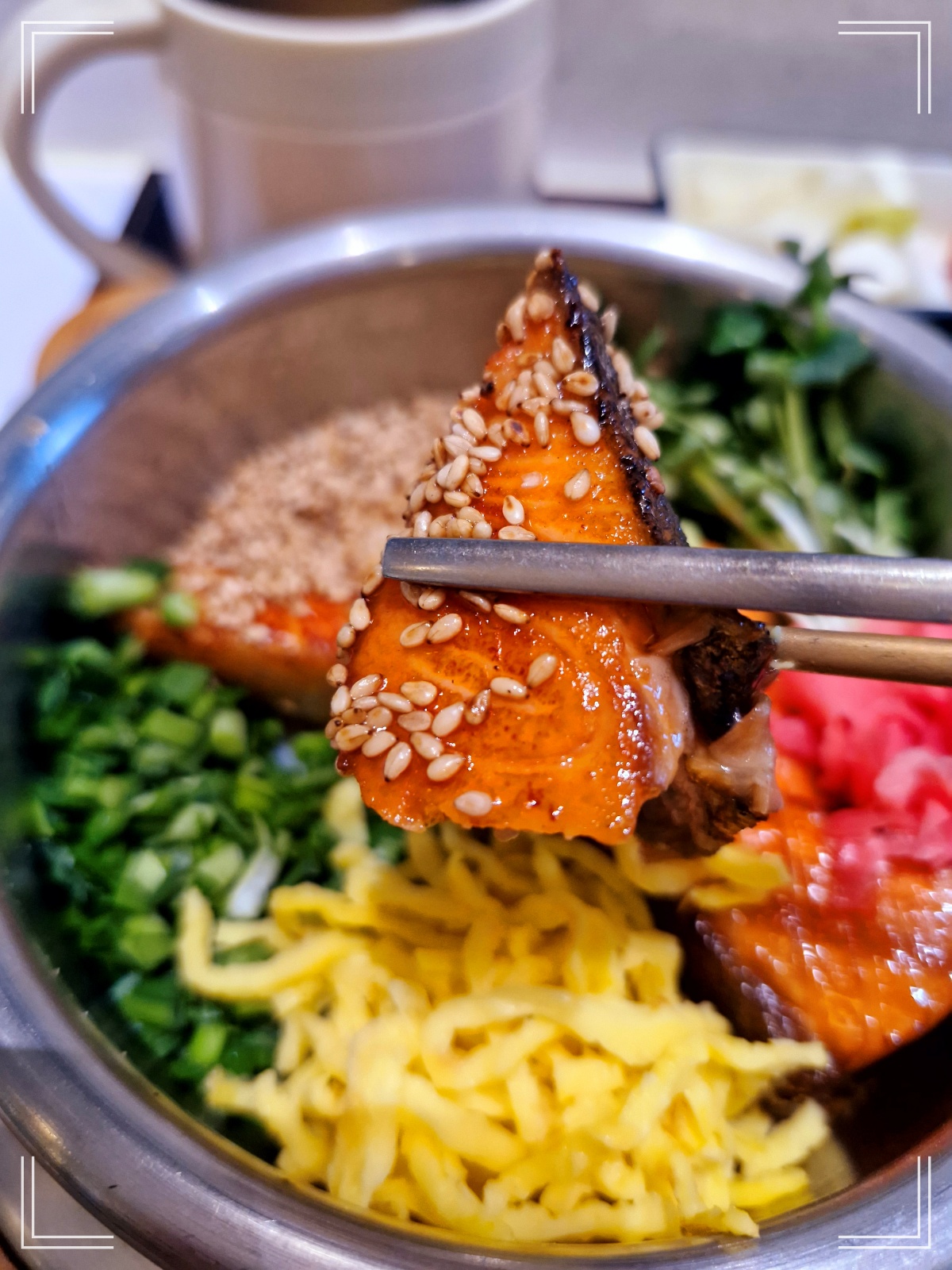 연어 솥밥-와사비-계란지단-쪽파연어솥밥-잘 구워진 연어-소스에 버무려진 연어연어솥밥-다양한 재료들과 어우러진 솥밥-무순-와사비-초생강