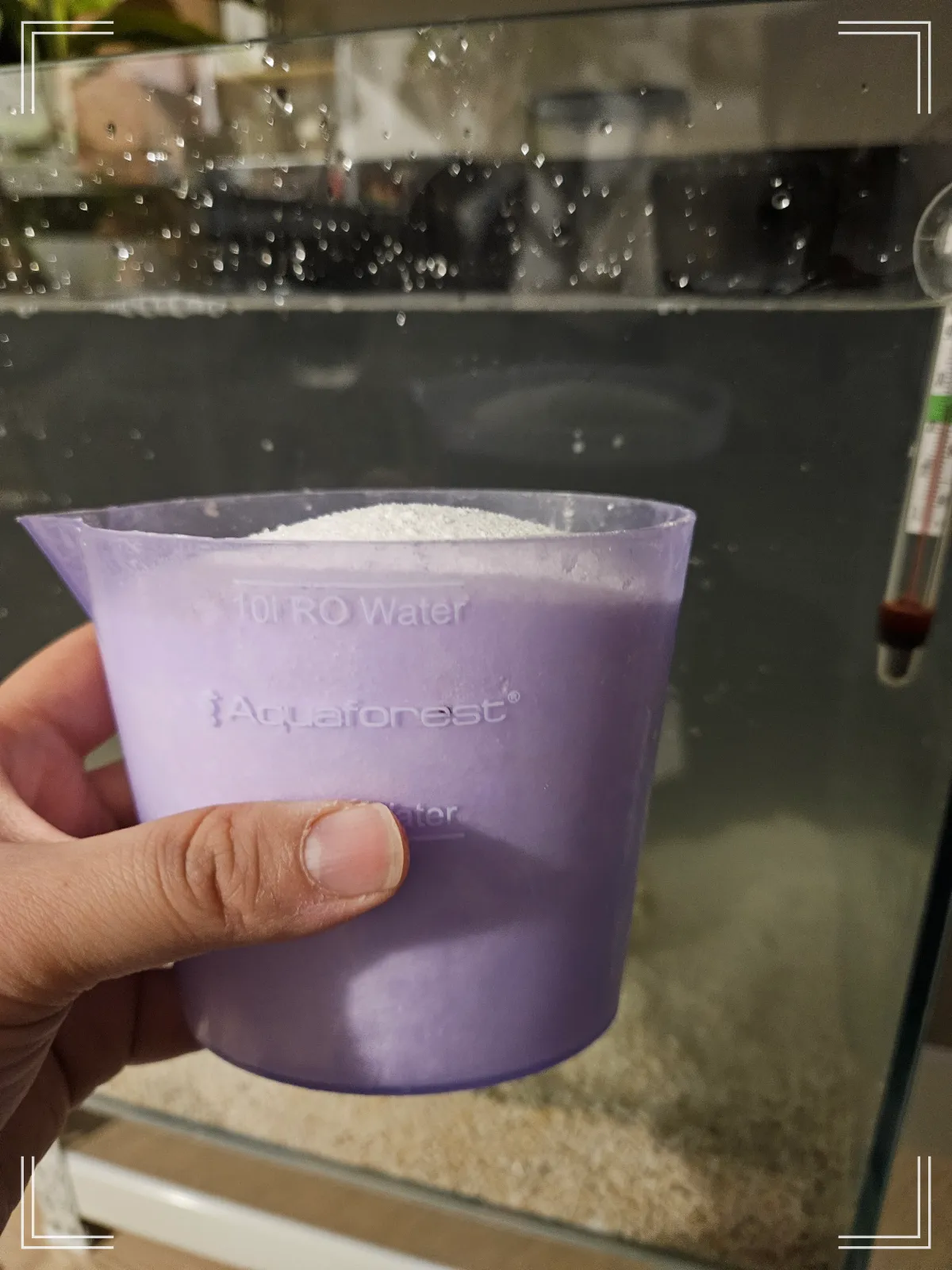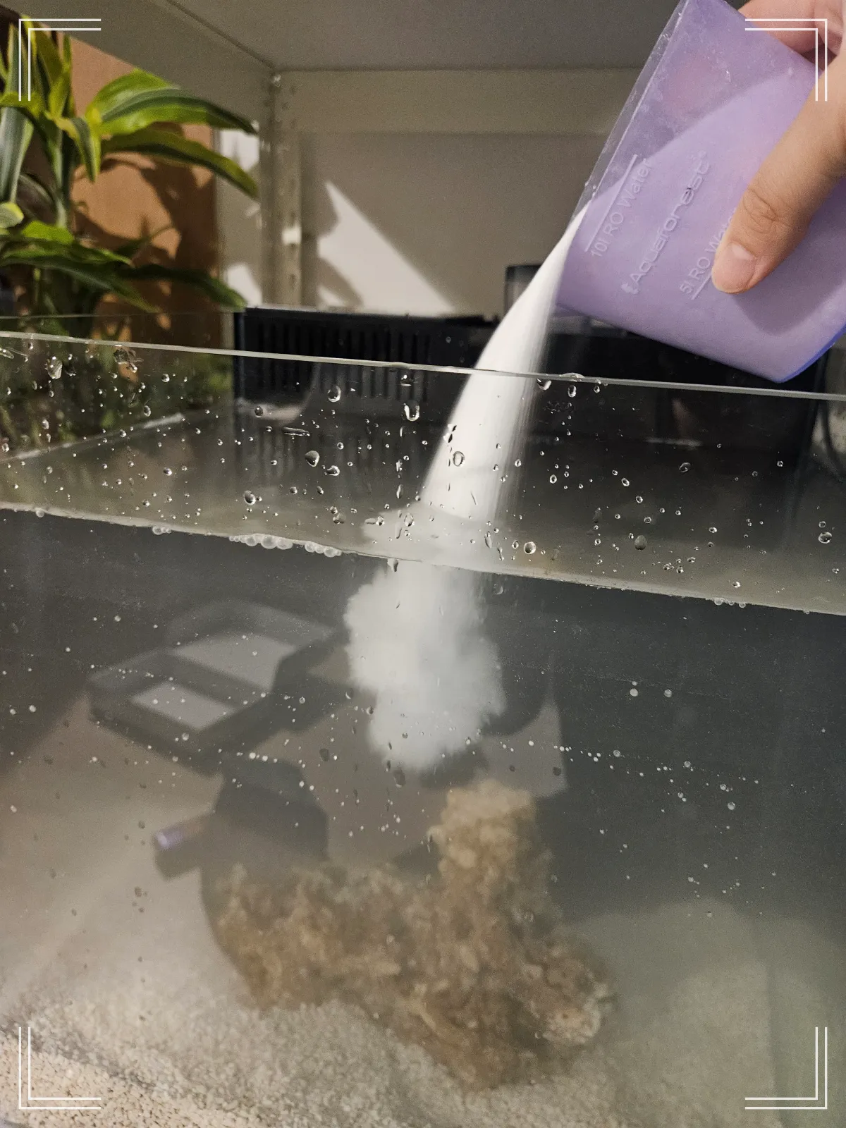 그리고 염분을 맞추기 위해 리프 솔트를 부어줘요. 다양한 미량영양소가 들어있는 해수염인데요. 사장님 추천으로는 한 번에 다 넣기보다는 총량을 두 번으로 나누어 이틀에 걸쳐 넣는 걸 추천하셨어요. 이렇게 하면 물안정에 더 도움이 된다고 하시더라고요. 저는 해린이니까 사장님이 말씀해 주신걸 그대로 따라 했어요. 일정 시간이 흐른 뒤 염도 측정기를 이용해서 염도를 측정해 주어요. 24 ppt를 맞춰주어요. 한 번 염도를 세팅해 두면 수조의 물이 증발해서 물의 양이 줄어들어도 염도는 유지되어서 수조 뒤쪽에 일반 물(수돗물)만 추가로 부어주면 돼요. 그러면 알아서 장비들이 돌아가면서 물 높이와 염도를 적정 수준으로 맞춰줘요. 그래서 특별히 어려운 건 없어 보여요.