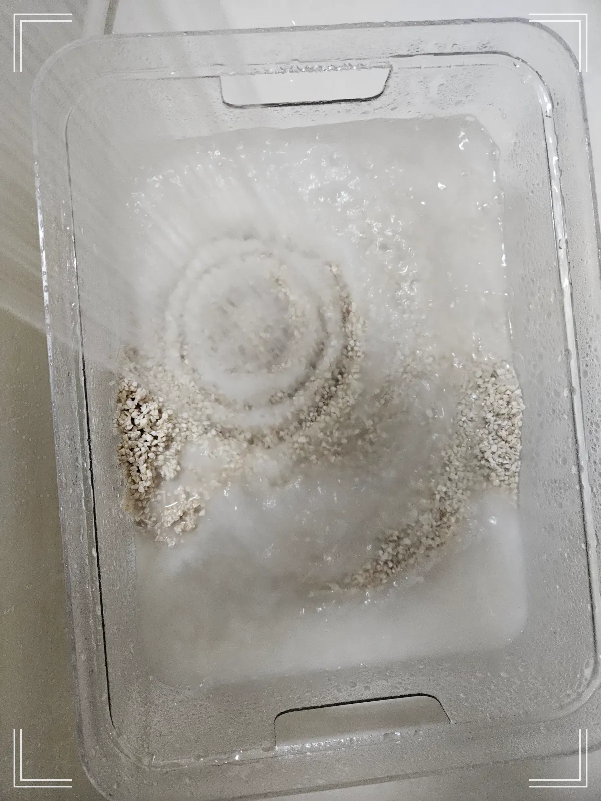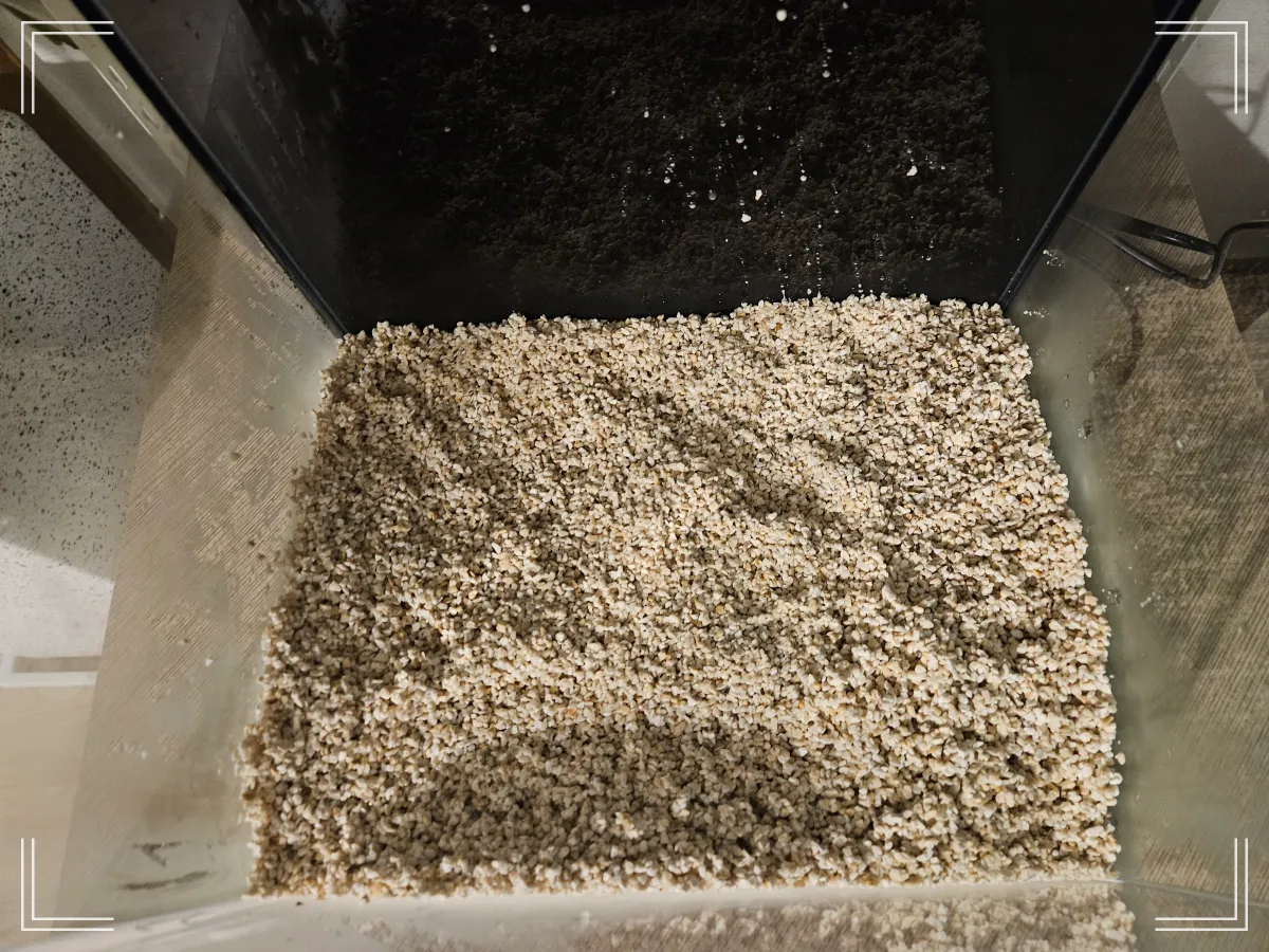 어떻게 보면 가장 기초공사인 선반을 조립합니다. 예상했던 것보다 조금 높은 선반이 와서 중간칸에 수조를 배치해 보았어요. 조금 더 안정감이 있는 느낌이네요. 위아래 선반은 기타 물품들을 놓을 수 있도록 공간 배치를 해주었어요. 그리고 수조를 살짝 얻어서 봅니다. 그리고서는 팔레오센즈의 바닥재를 깔아주는데요. 새로운 바닥재의 경우 분진이 생길 수 있어서 물에 3~4번 정도 쌀 씻듯이 여러 번 씻어요. 그리고 수조 바닥에 깔아보아요. 그리고 이제 물을 부어주어야 하는데요.